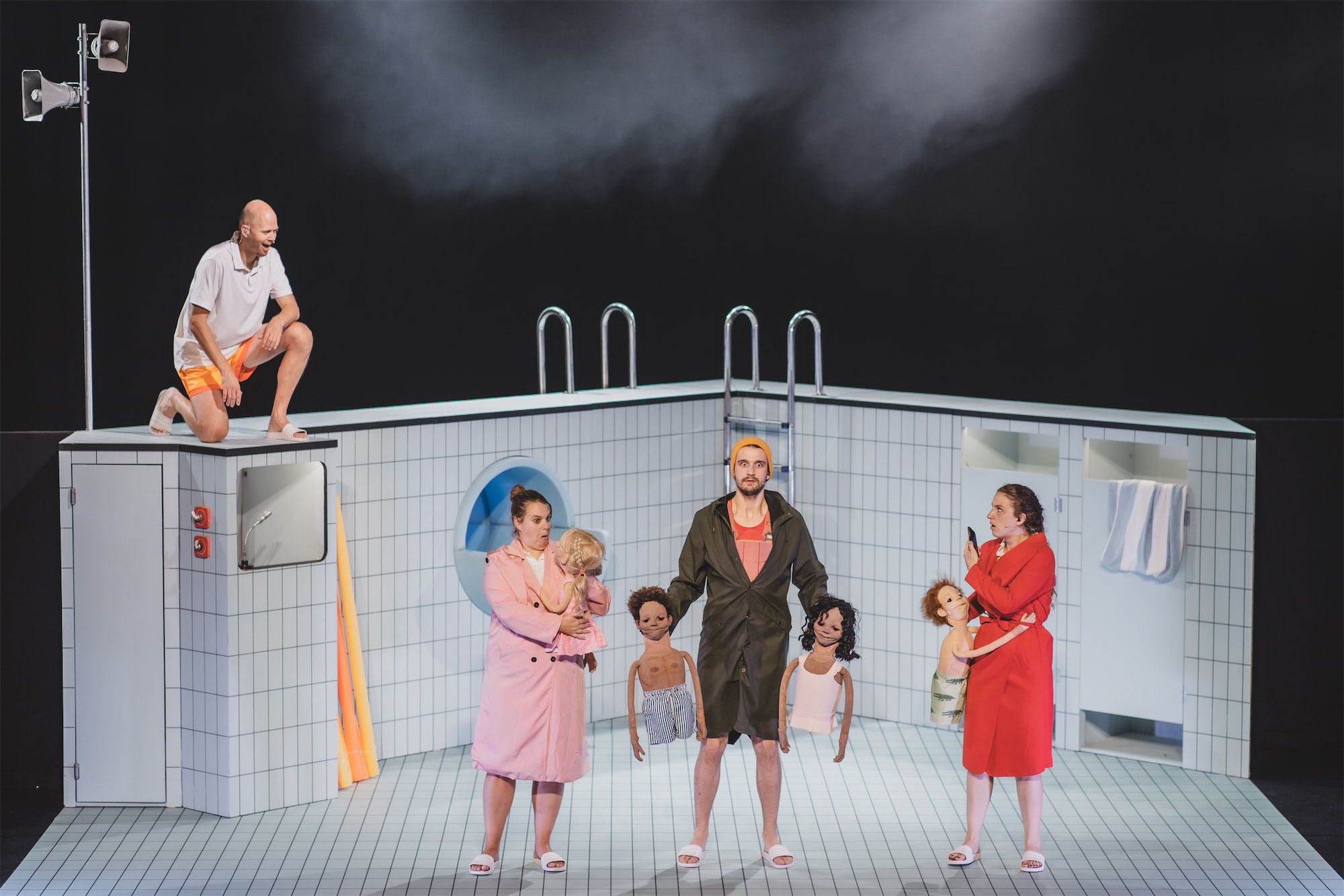De voorstelling speelt zich af in een fantasierijk zwembad met herkenbare plekken: de glijbaan, het loket van de badjuf, de kleedhokjes. Ook de ruimte achter het decor wordt in spel meegenomen, waardoor een onverwachte wereld ontstaat waarin je soms tegelijk onder water én op de kant bent.