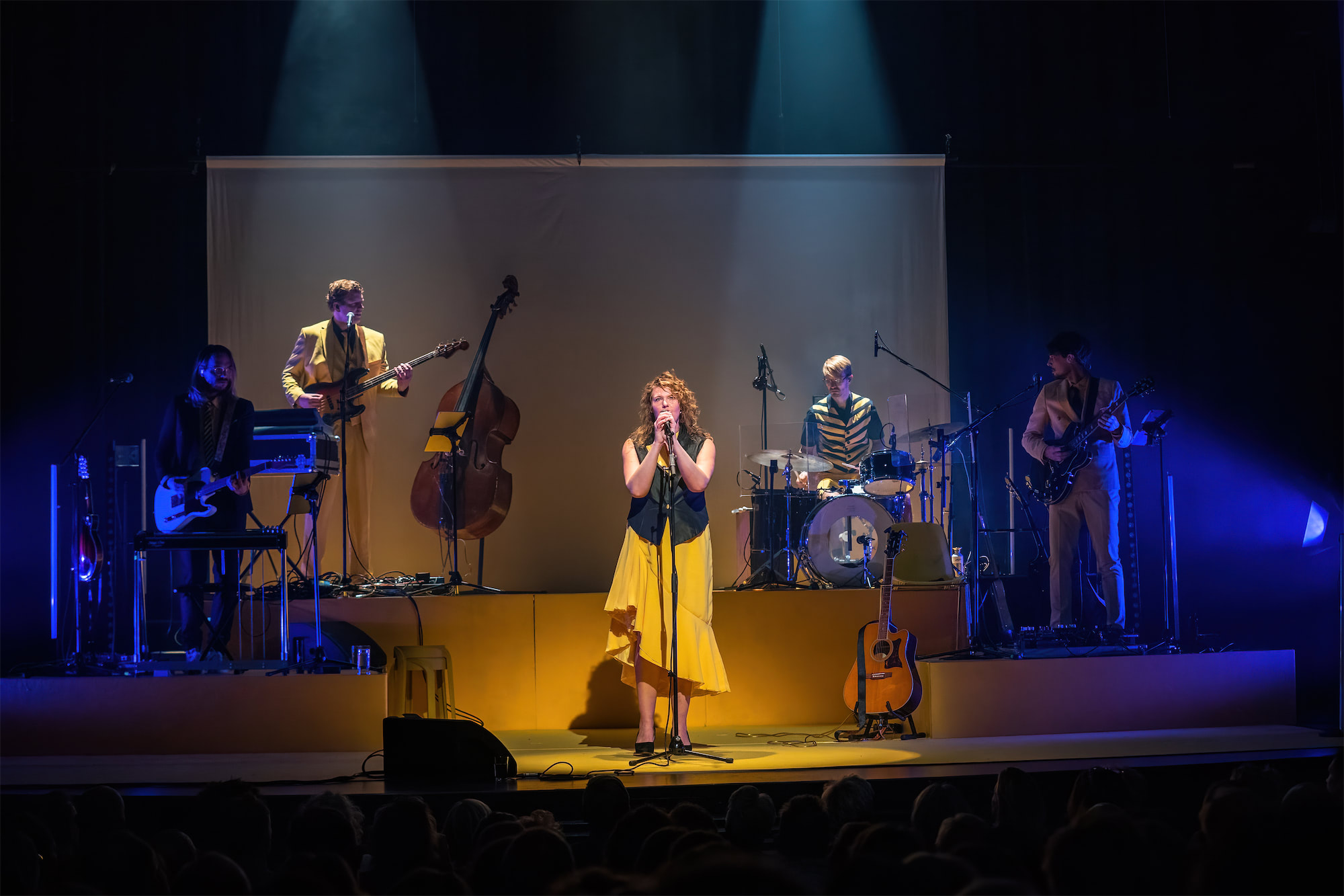 De voorstelling draait letterlijk om Kiki: de opstelling maakt haar het middelpunt. Het geel van vloer en achterdoek geeft een energieke vibe. Met de doeken die omhoog en omlaag kunnen, ontstaat ruimte om sommige nummers intiemer te maken. Naar het einde toe wordt het beeld juist meer open, leger en rauwer.