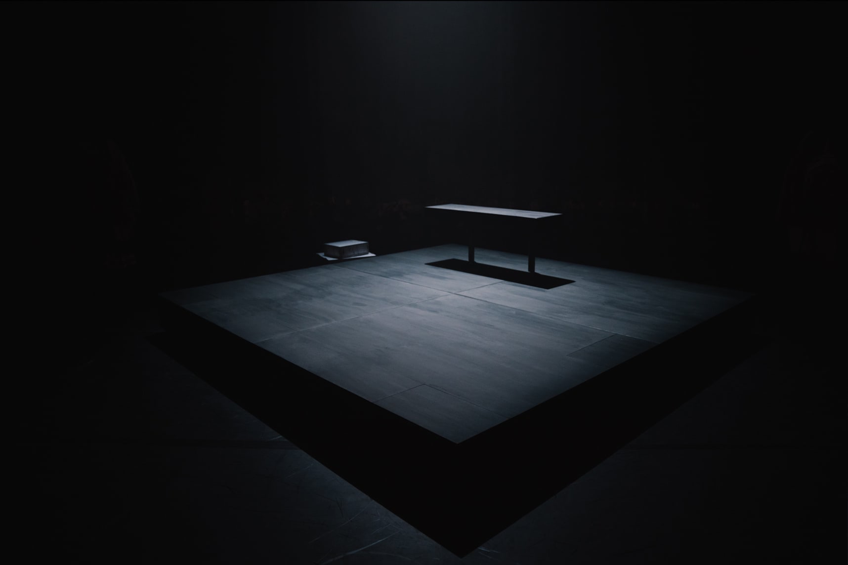 Om op een simpele manier de verschillende locaties helder te maken is er gekozen voor een platform met een bankje erop. Het platform is draaibaar, waardoor het bankje iedere locatie op een andere plek is. Achterop hangt een doek, dat doet denken aan een overstroming of verbrande natuur.