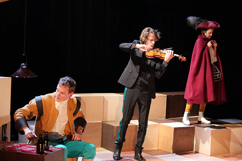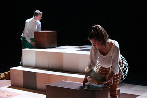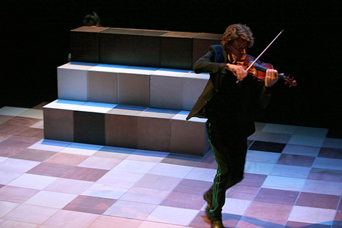 Het beeld bestaat uit meer dan 30 houten blokken. Door deze te verschuiven veranderen de acteurs steeds van locatie. In, op en rondom de blokken verschijnen attributen die dan weer een kathedraal, een huiskamer of een café vormen. Door een doek met lijntekening achter de blokken te rollen uit te rollen lijken Mozart en Nanerl in de koets op reis in Europa te zitten. Op een van de blokken zit een koperen strip. Door deze met hun vingers aan te raken kunnen de acteurs zelf de pianomuziek "spelen".